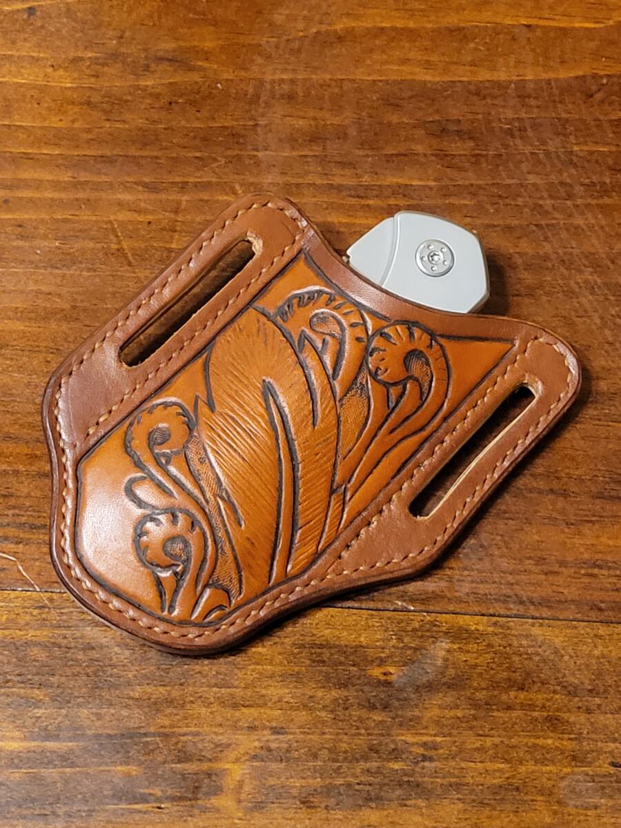 Here’s a more universal sheath that fits most folding blades that are 2″-3″ long. I can tool or laser something specific on if you like. Can also be made for left or right draw. Slips on your belt comfortably and isn’t going to go anywhere.
